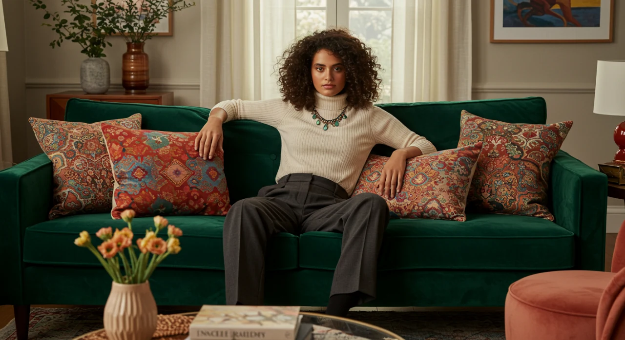 Imagine: um sofá de veludo com almofadas de linho, sobre um tapete de lã, em uma sala com paredes de tijolo aparente. A mistura de texturas cria um ambiente rico e convidativo!