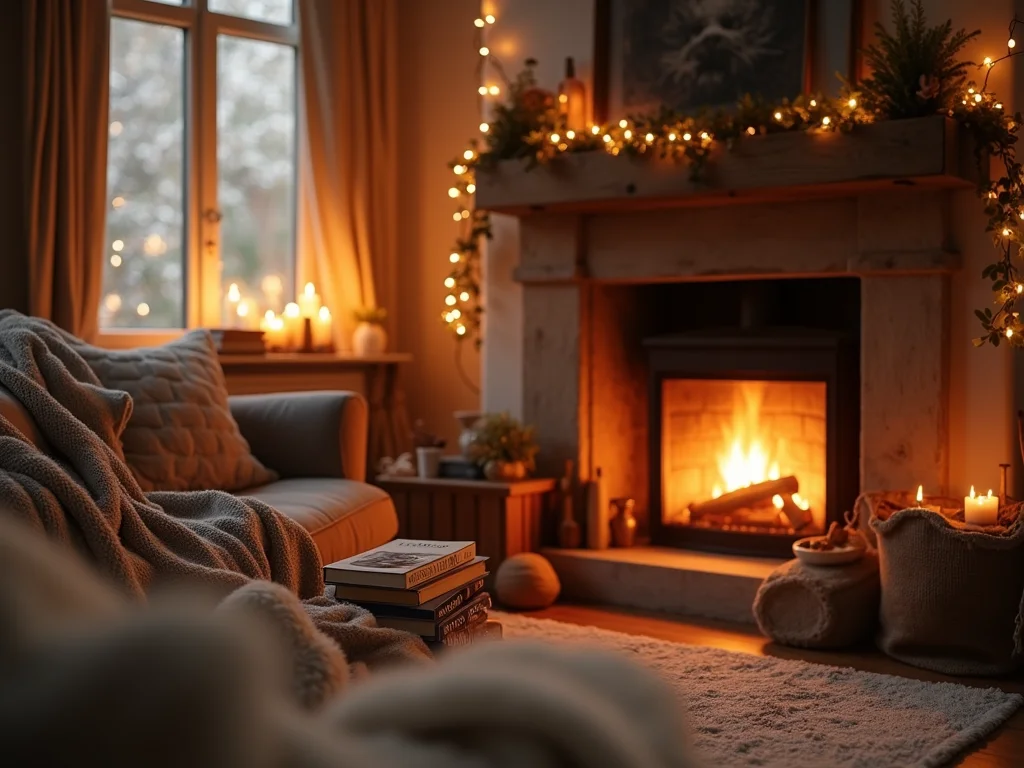 A sensação tátil é fundamental. Pense em camadas: mantas de tricô, tecidos macios e aconchegantes em sofás e poltronas.