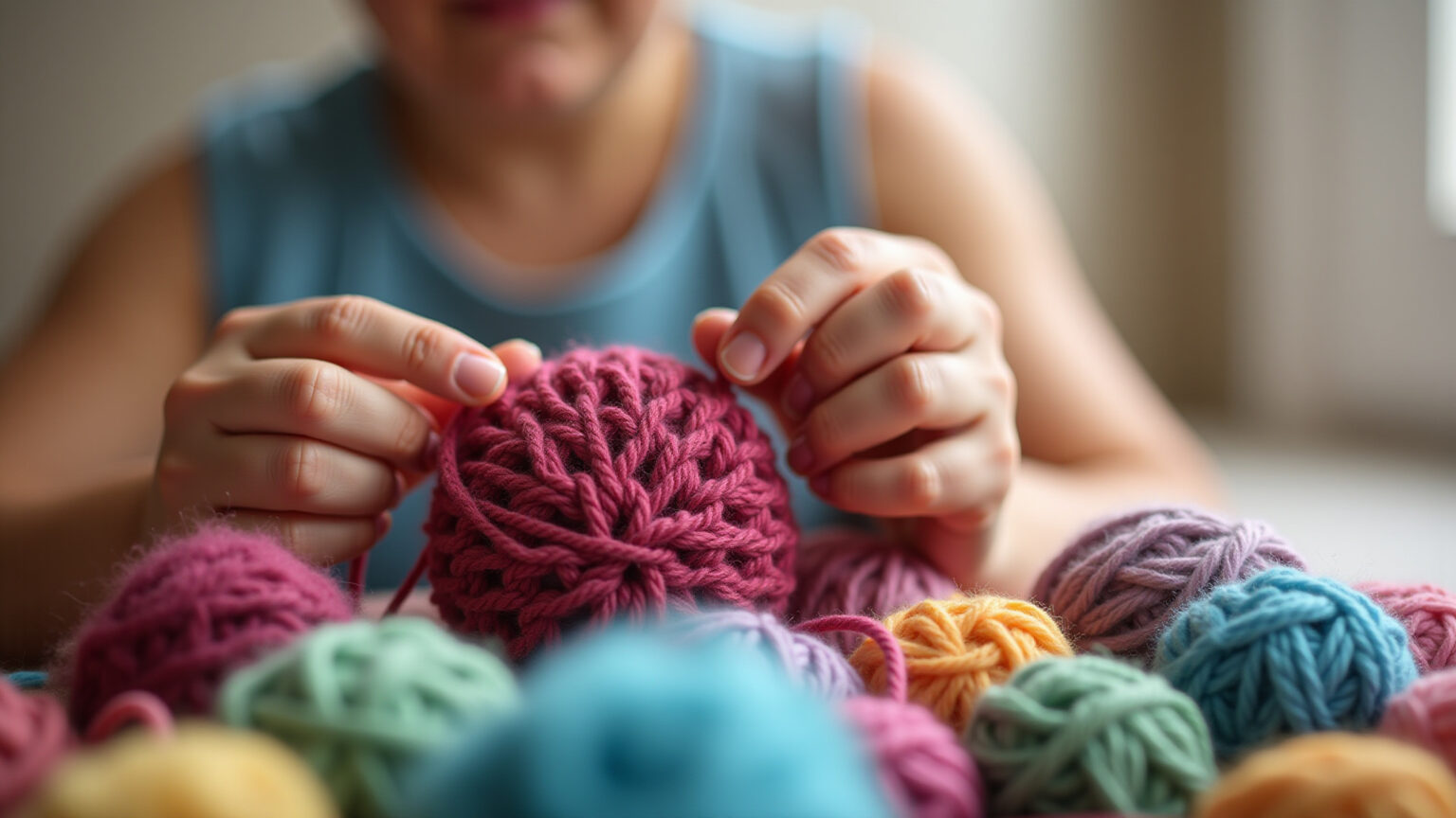 Mãos habilidosas crocheteando fios coloridos, foco nos detalhes do crochê.