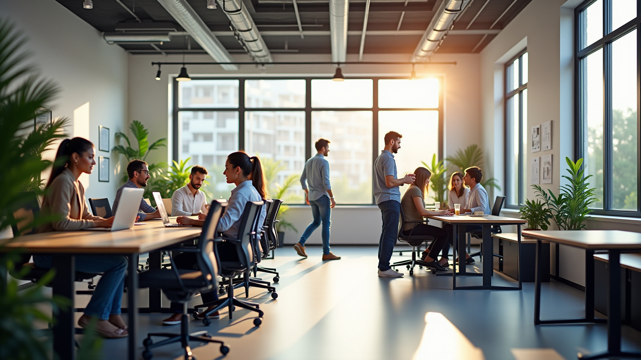 Escritório moderno e flexível com design biofílico e iluminação natural.