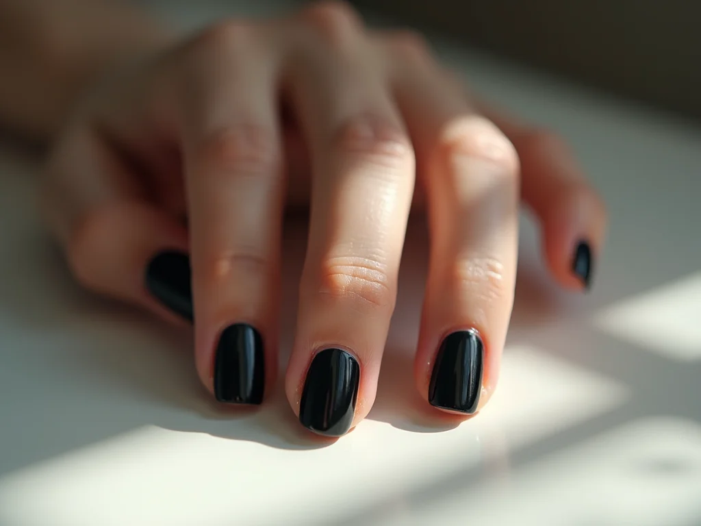 Unhas em formato quadrado arredondado com esmalte preto clássico, em um ambiente com iluminação natural difusa.