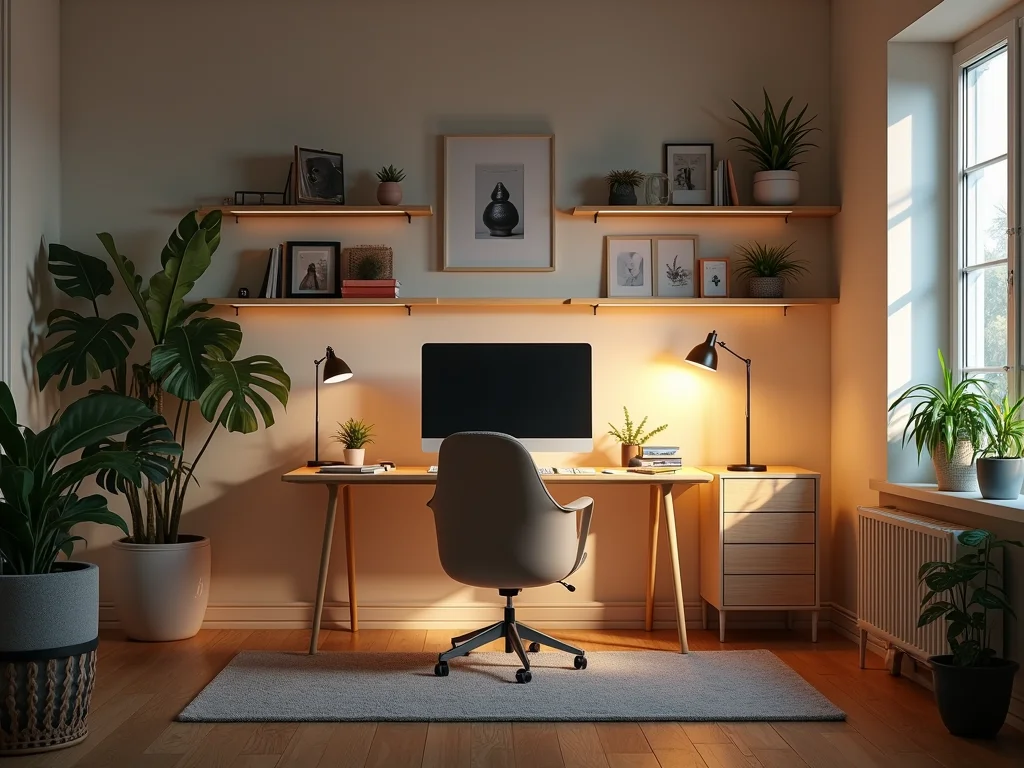 Home office com iluminação indireta suave, criando um ambiente calmo e focado, com móveis de linhas retas e claras.