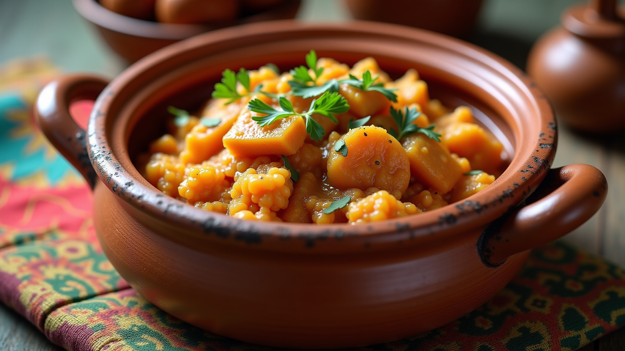 Frango com Quiabo caseiro fumegante em panela de barro.