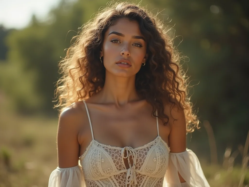 Mulher em uma paisagem natural, como uma praia ao pôr do sol, com o sol refletindo no mar e criando um brilho dourado na pele, silhueta destacada.