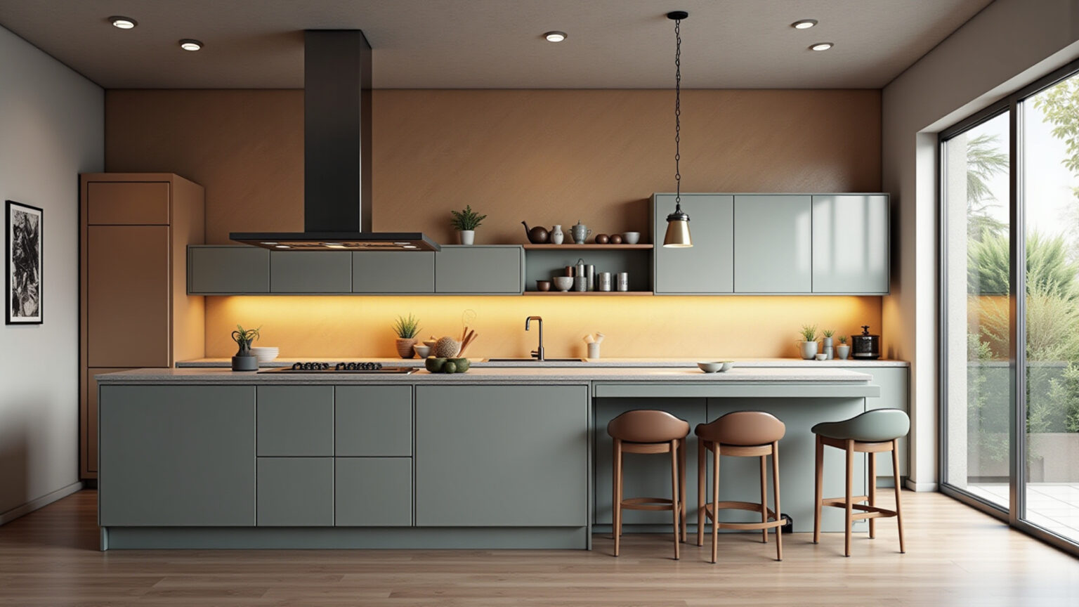 - Iluminação geral: Utilize spots ou luminárias embutidas no teto para garantir uma iluminação uniforme em toda a cozinha.