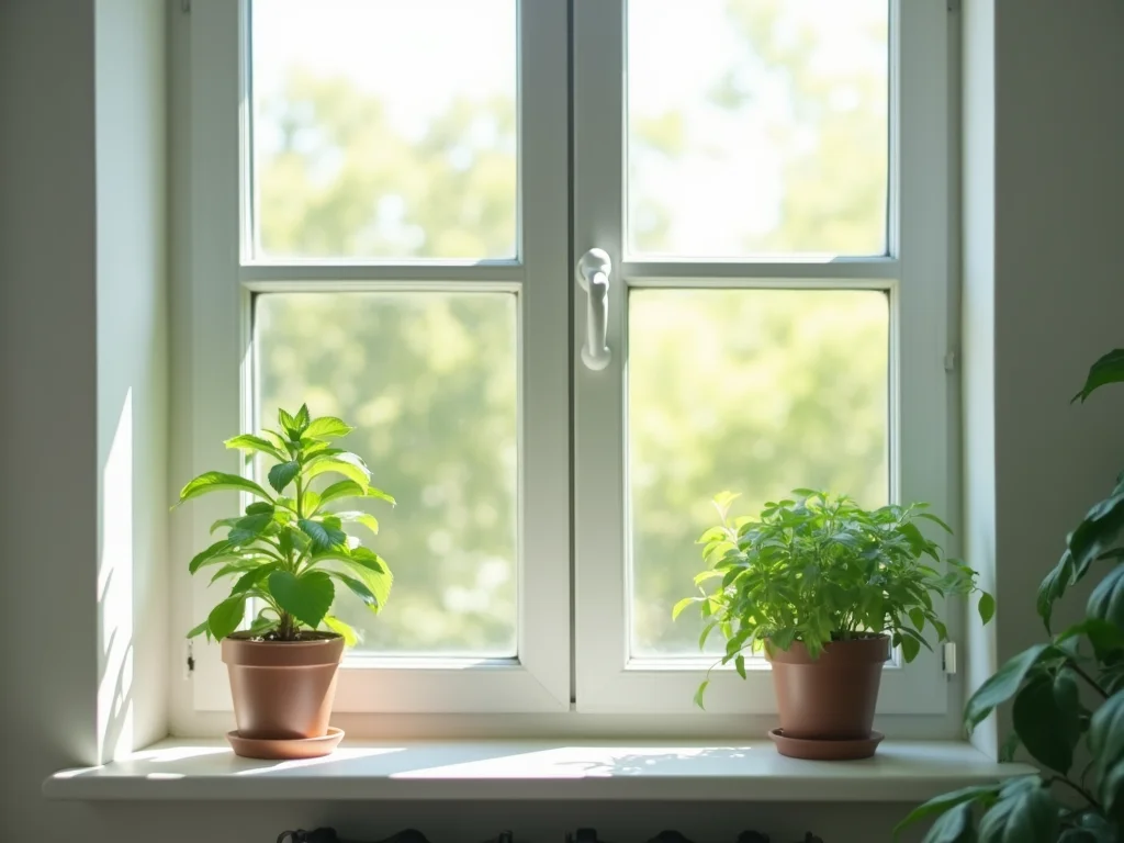 Vaso de hortelã em vaso posicionado em uma janela ensolarada, recebendo cerca de 4 horas de sol direto, com o solo visivelmente úmido.