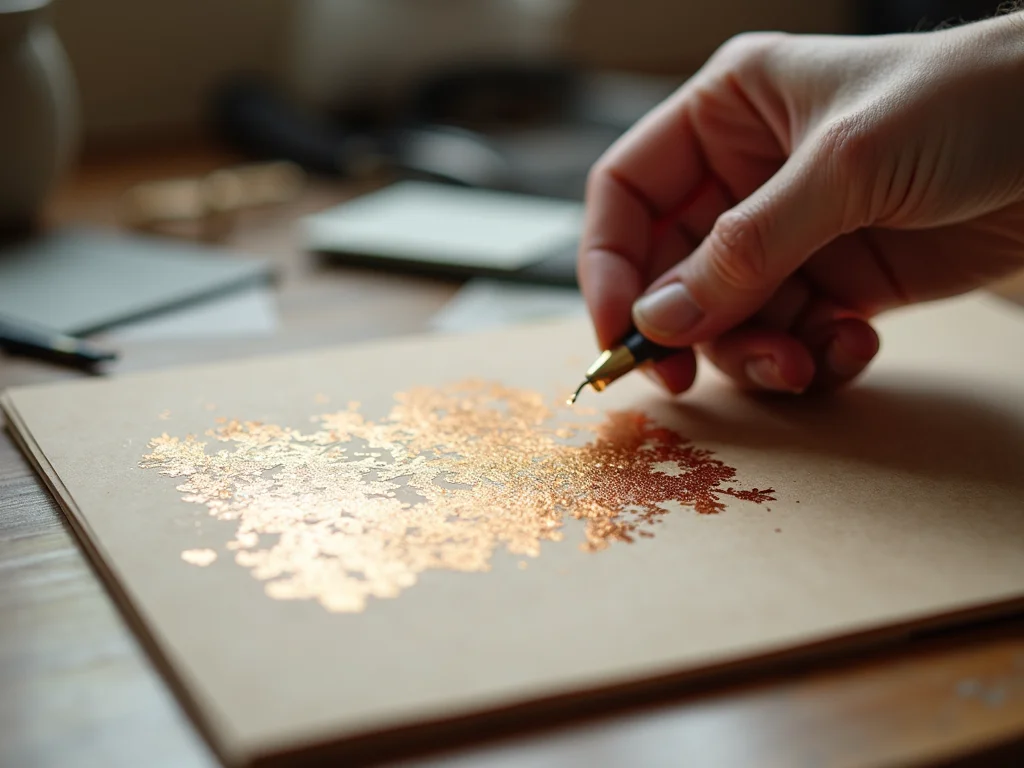A gente pensa que é complicado, mas é mais acessível do que parece. Basicamente, a técnica envolve transferir uma fina camada de metalizado (geralmente dourado, prateado ou colorido) para o papel ou outro material usando calor e pressão. Você pode conseguir resultados incríveis com materiais simples que encontra fácil. Fica tranquilo(a), o efeito que dá é de algo super sofisticado, que chama a atenção na hora.