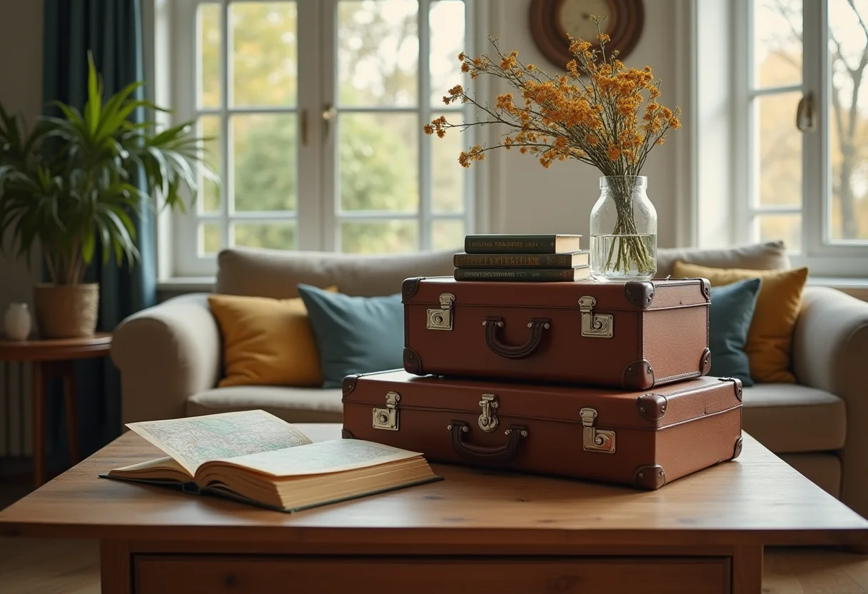 Mesa lateral com malas antigas: funcionalidade e estilo