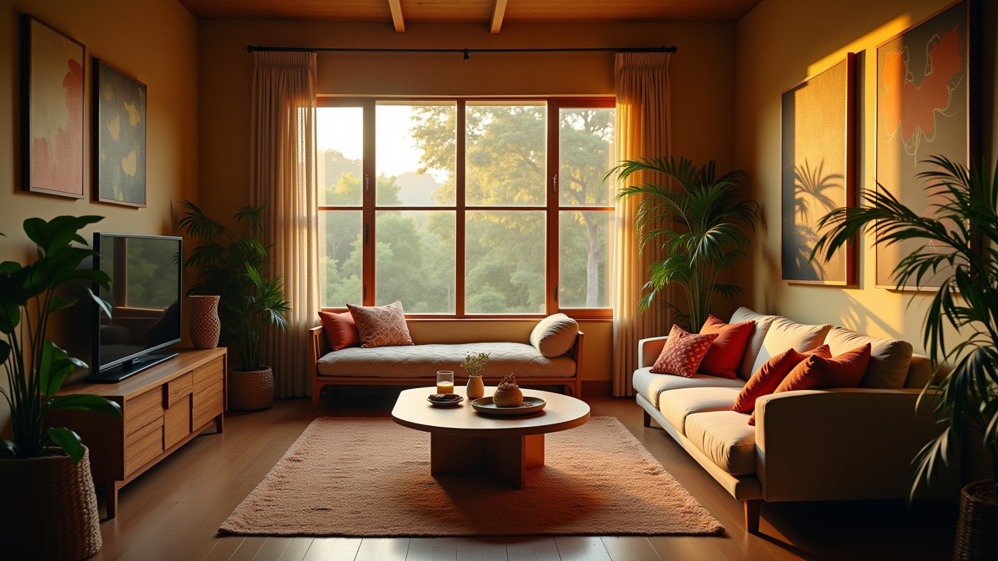 Sala aconchegante com iluminação indireta suave, design brasileiro e cores quentes.