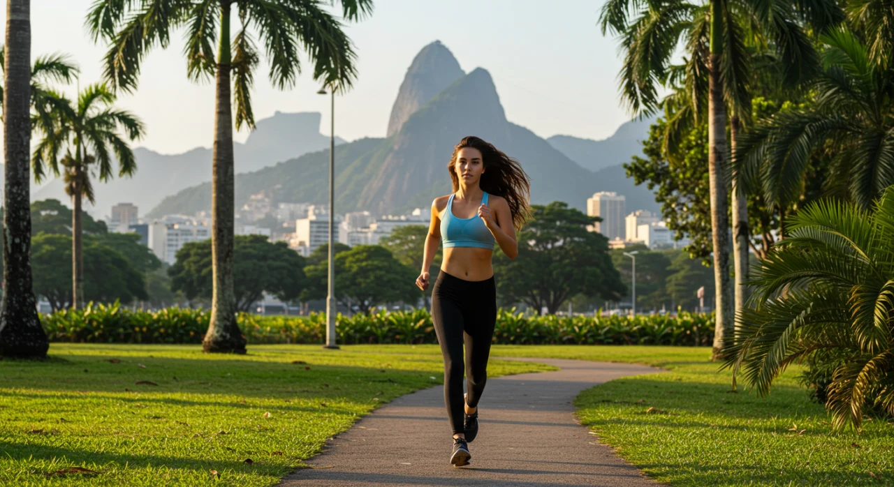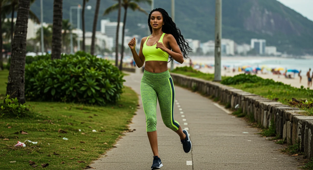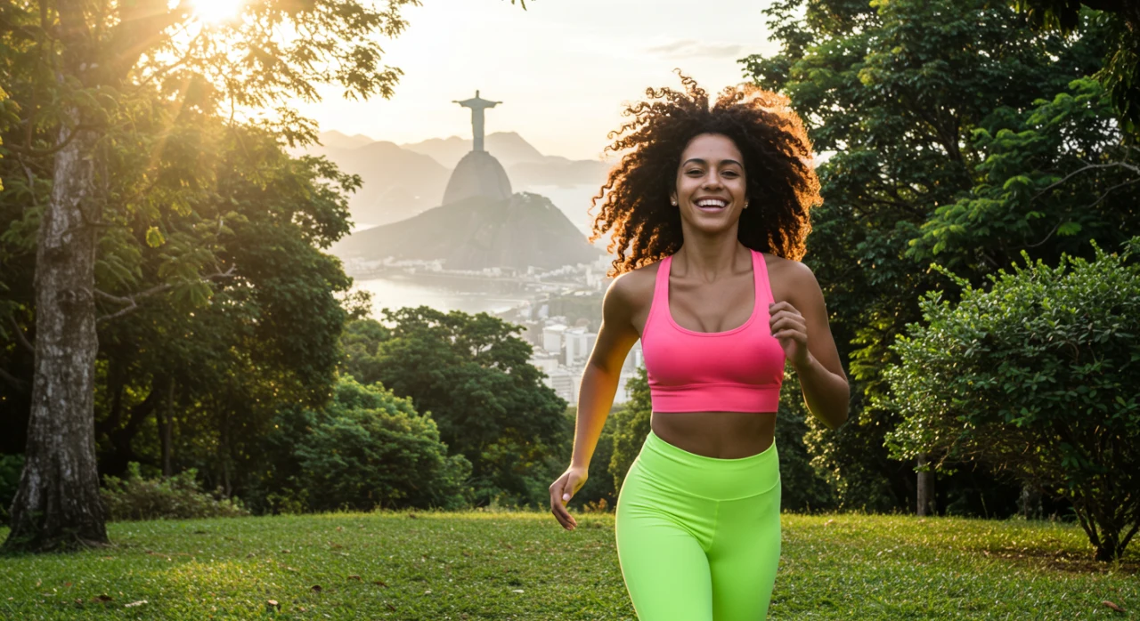 Mulher correndo no parque, vestindo roupas esportivas estilosas, Rio de Janeiro.