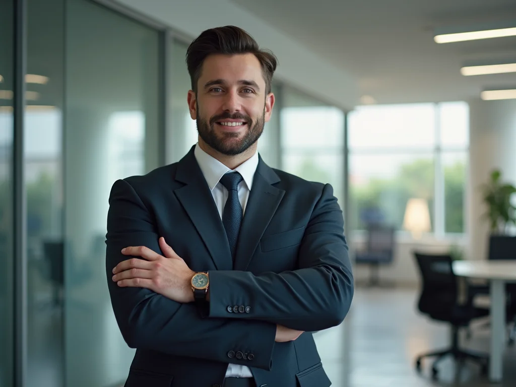 Homem em terno azul-marinho bem cortado, camisa social branca de algodão e gravata discreta em tom de azul escuro, em pé em frente a uma parede de tijolos aparentes com iluminação focada.