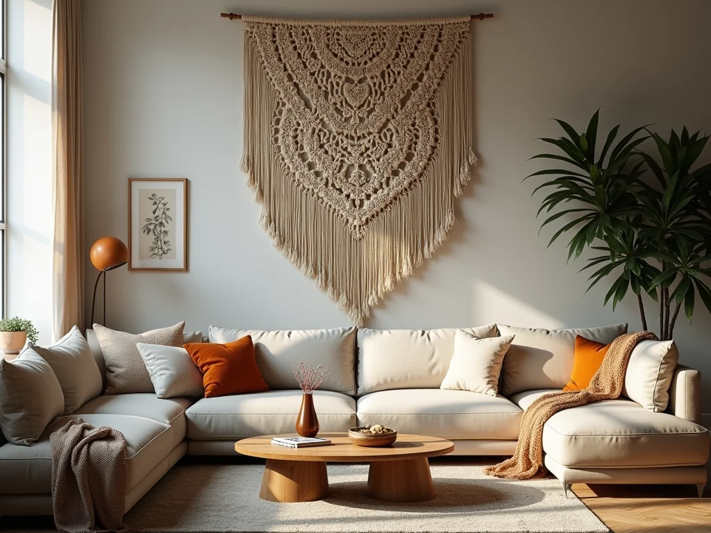 Peça de macramê grande com bastão de madeira natural aparente, centralizada em uma sala de estar ampla, com um tapete redondo de fibra natural abaixo.