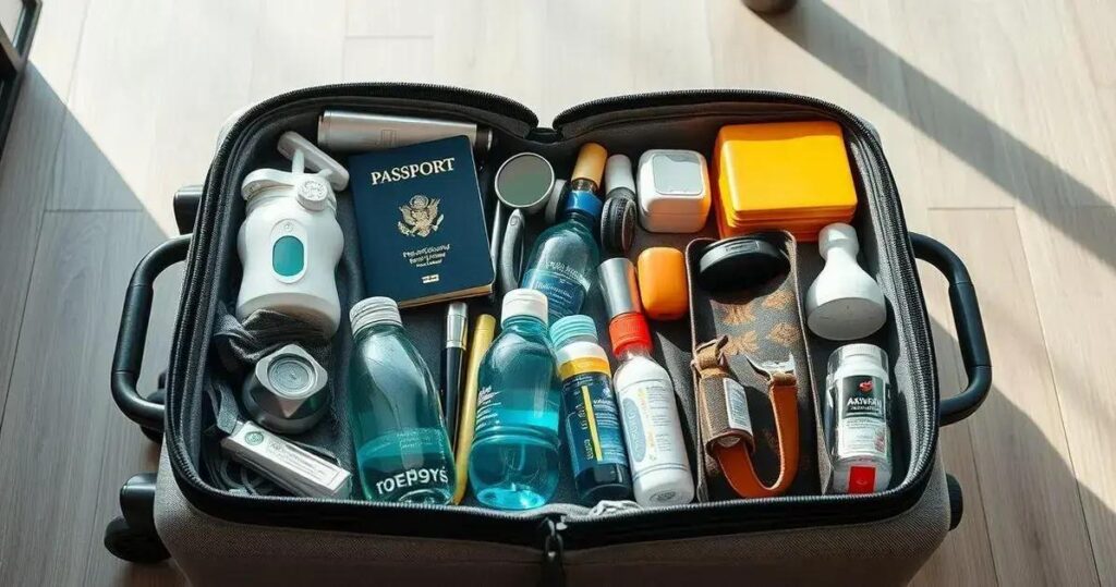 Primeiro, pense na sua documentação: passaporte, carteira de identidade, cartão de embarque (impresso ou no celular – mas lembre-se de ter bateria!). Aí, guarde esses documentos em um lugar seguro, de fácil acesso.