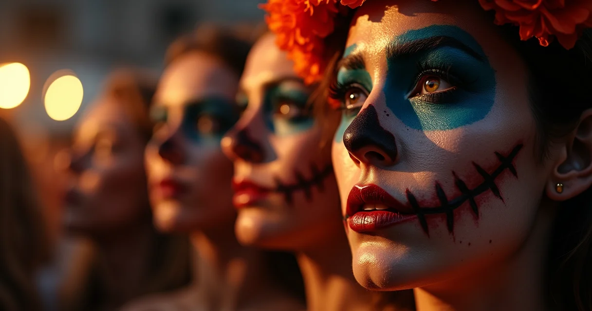 A maquiagem de ‘sugar skull’ (caveira mexicana) exige precisão nos traços e a escolha de cores vibrantes para honrar a tradição, criando um visual festivo e sombrio.