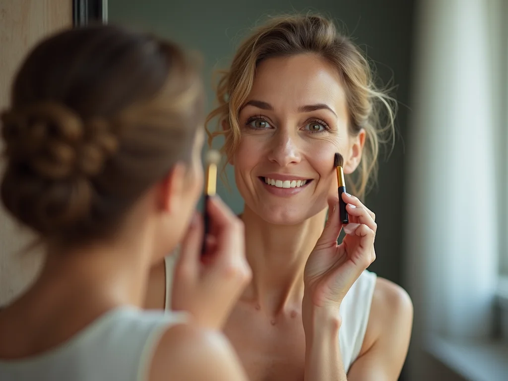 Para um visual natural em pele envelhecida, foque em produtos que ofereçam um acabamento leve e hidratante. Prepare a pele com um bom skincare, use bases fluidas ou séruns, corretivos pontuais e blushes cremosos. O objetivo é realçar sua beleza sem pesar.