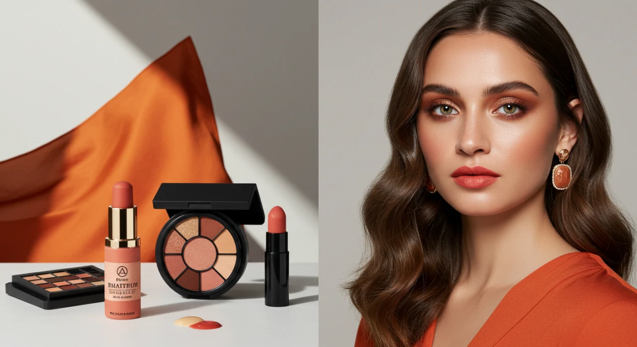 Maquiagem em tons terrosos complementa vestido laranja, ideal para um visual elegante e natural.