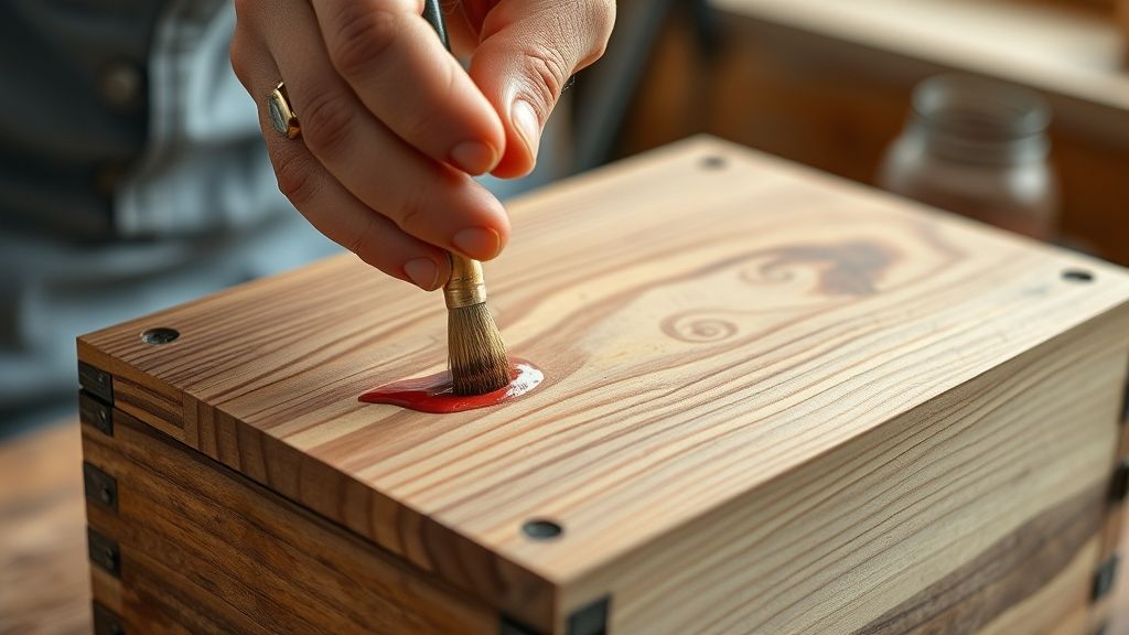 Artesão aplicando verniz em caixa de madeira, realçando os veios da madeira.