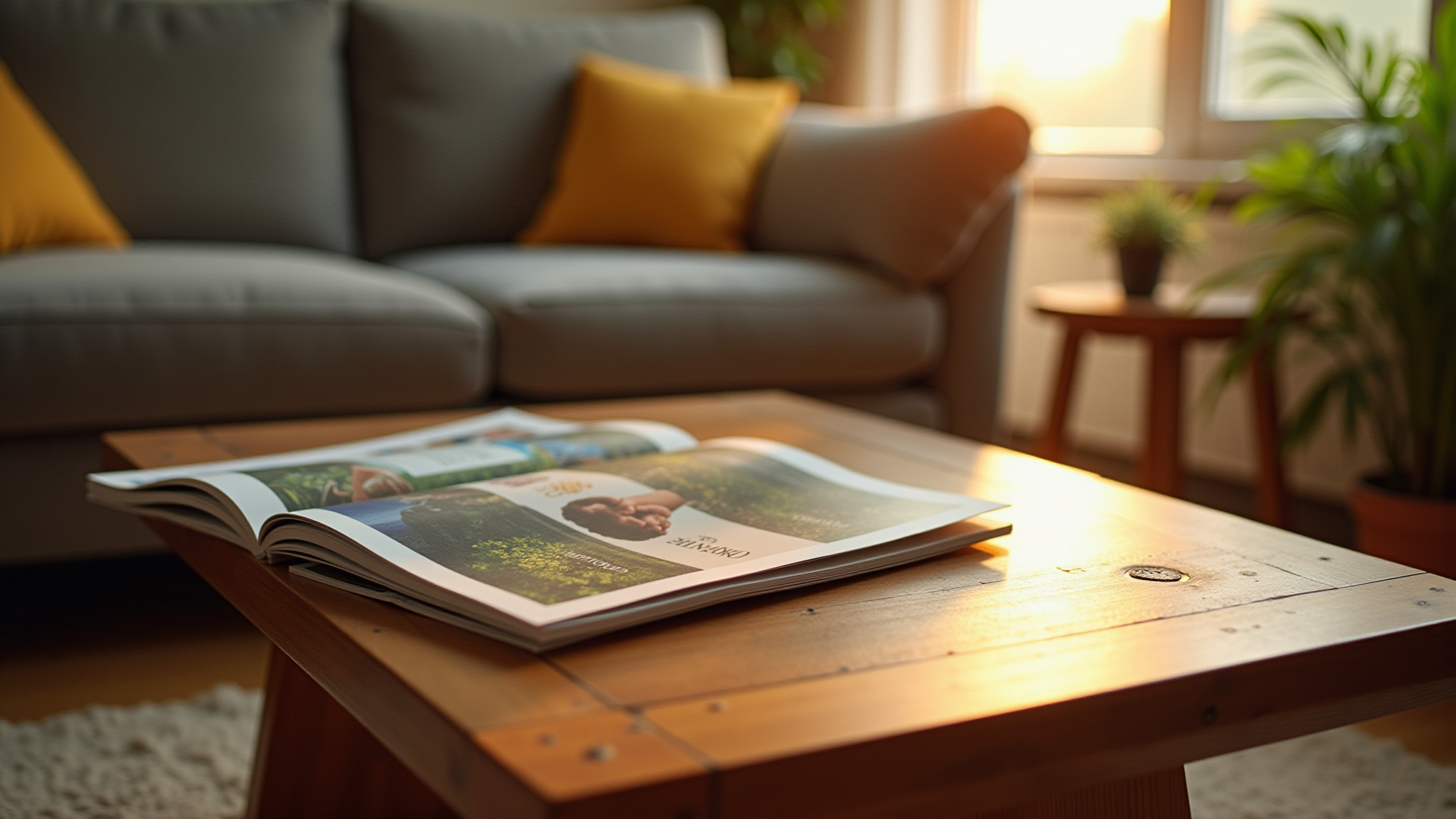 Sala aconchegante com mesa de centro de madeira, revistas e café.