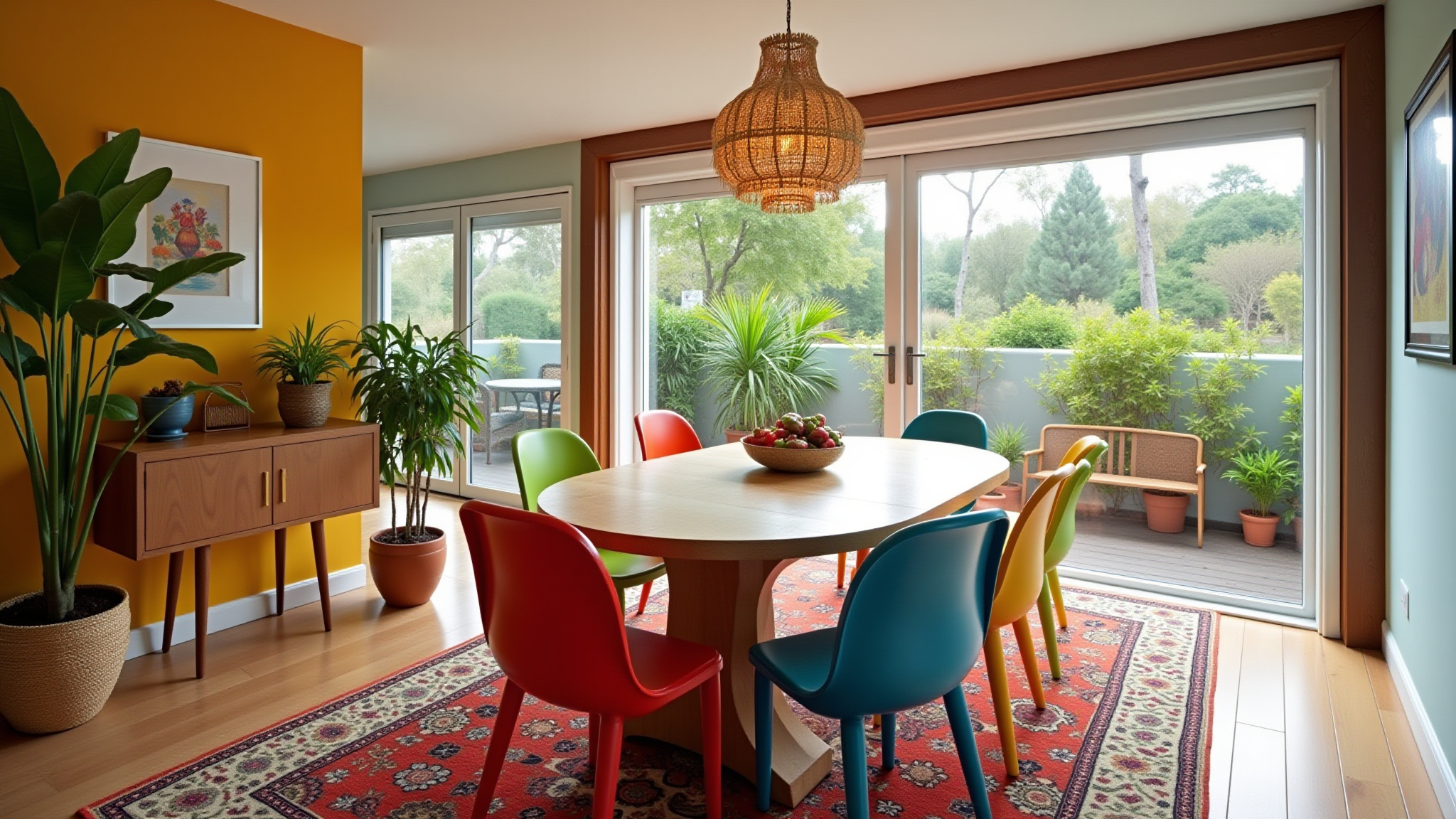 Mesa de jantar redonda de madeira com cadeiras coloridas em sala de jantar alegre.