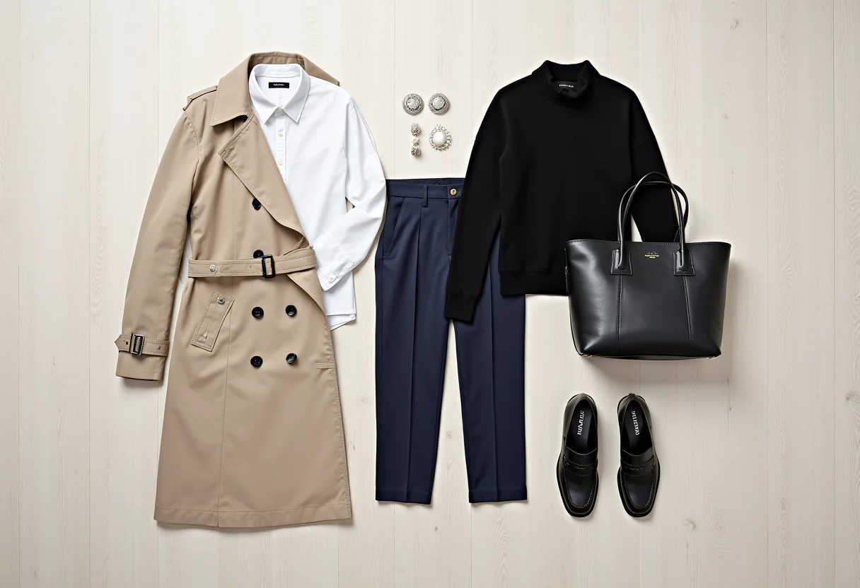 Peças ClássicasCalça de alfaiataria, camisa branca, blazer, trench coat, little black dress.