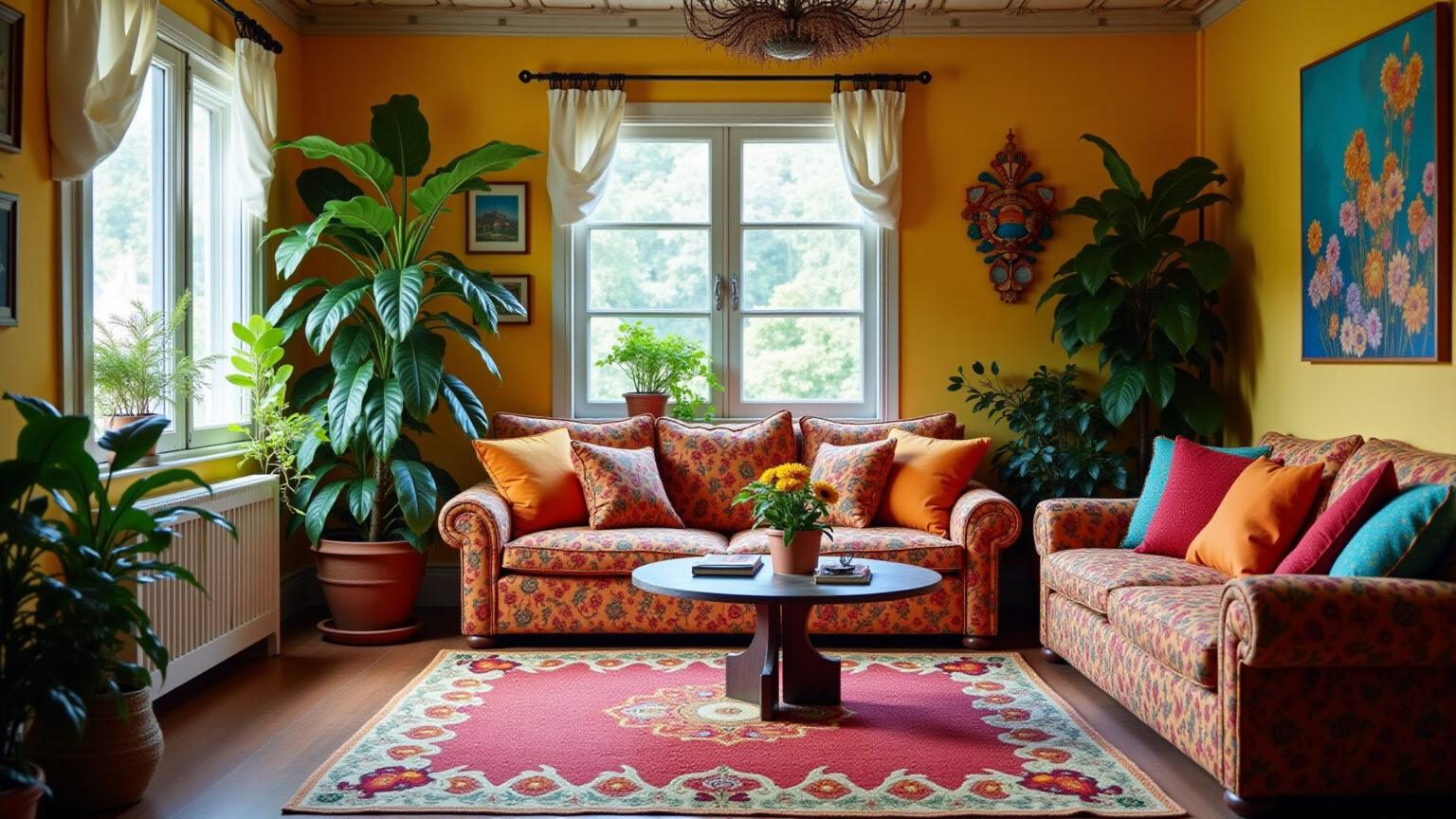 Sala vibrante com tapete de crochê redondo e colorido, móveis brasileiros e plantas exuberantes.