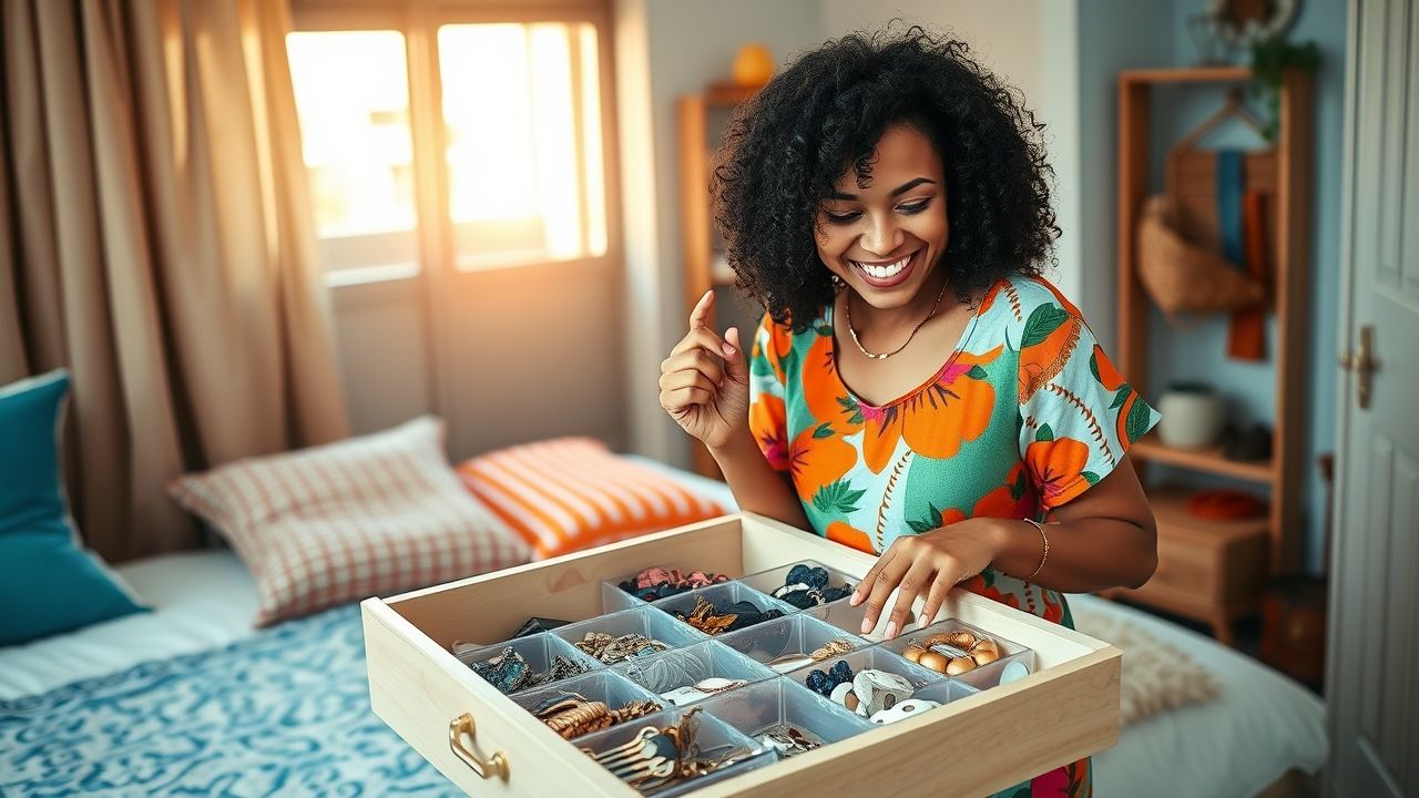 Eu adoro usar organizadores de gaveta para separar brincos, colares, pulseiras e anéis por tipo ou cor. Assim, fica muito mais fácil encontrar o acessório ideal para cada ocasião.