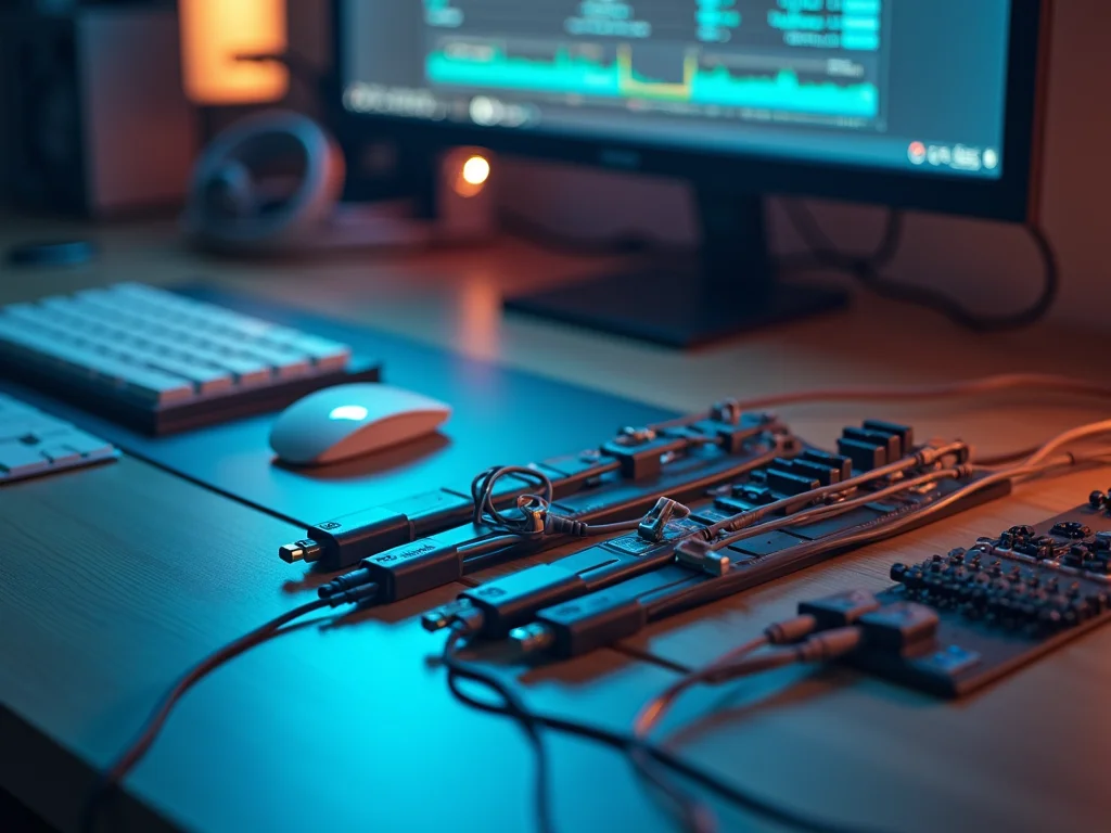 Vista aérea de uma estação de trabalho com organizador de cabos de silicone agrupando fios sob a mesa, criando um espaço de trabalho limpo.