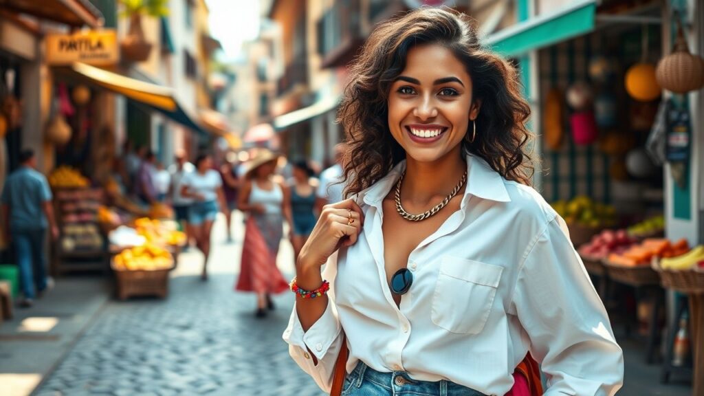 Mulher brasileira confiante com jeans e camisa branca, look casual e versátil para o dia a dia.