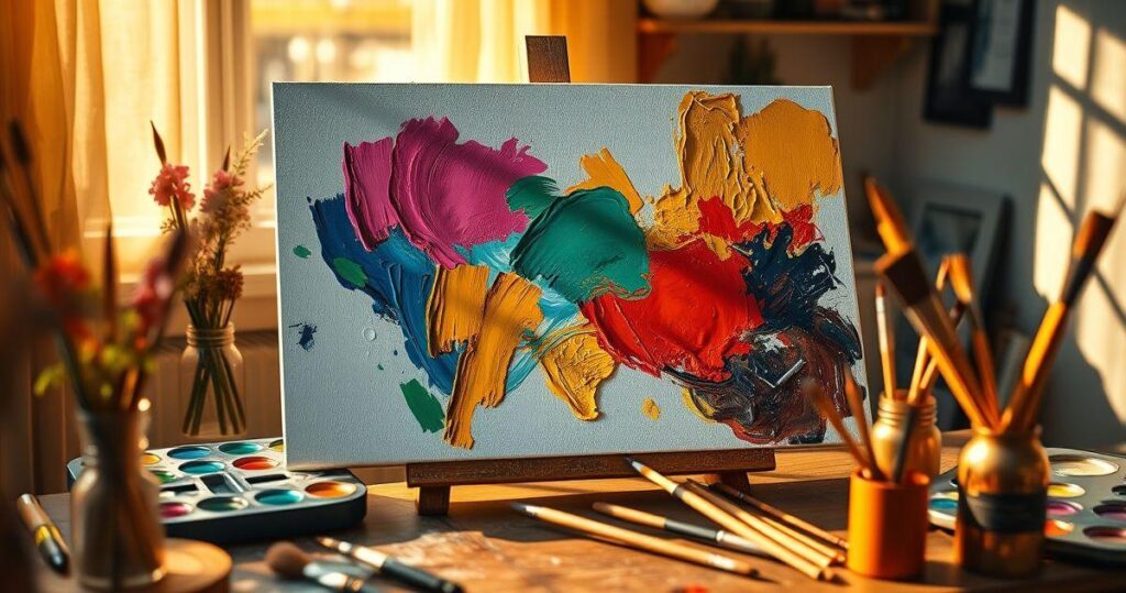 Pintura abstrata colorida expressando emoções internas. Autoconhecimento através da arte no Brasil.