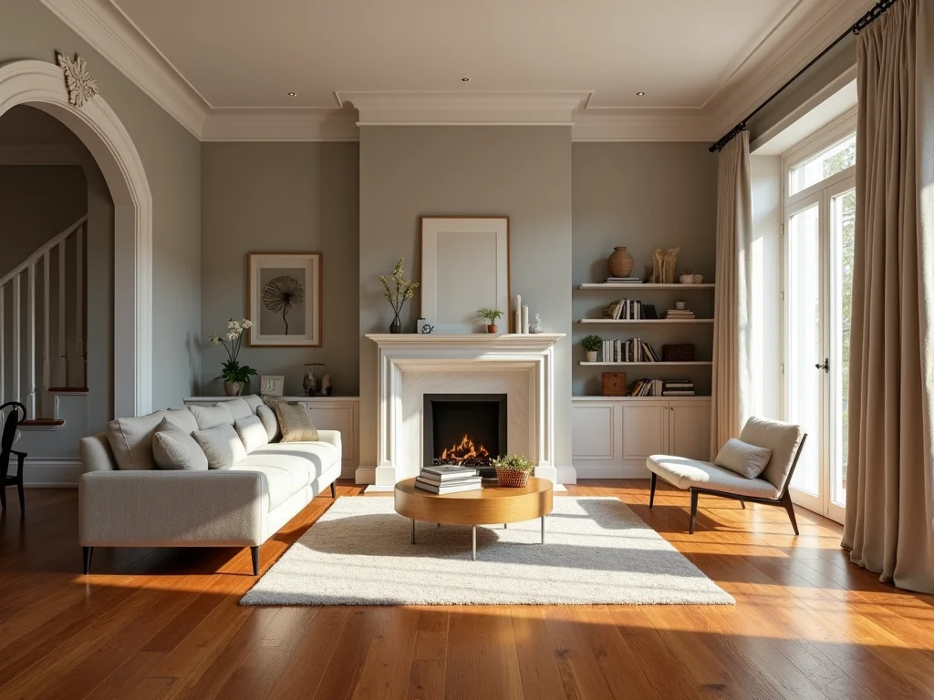 Sala de estar ampla com piso de madeira maciça em espinha de peixe, sofá cinza claro, mesa de centro de madeira escura e iluminação natural intensa.