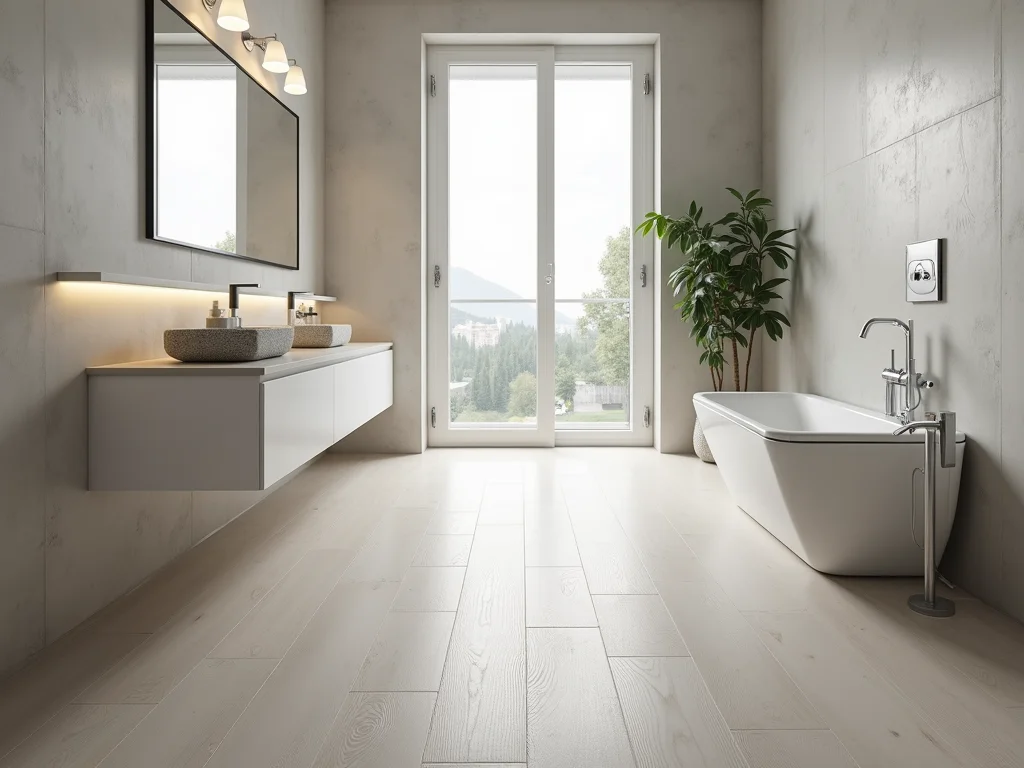 Piso vinílico em padrão de pedra clara, textura levemente rugosa, instalado em um banheiro com decoração minimalista e espelho grande.