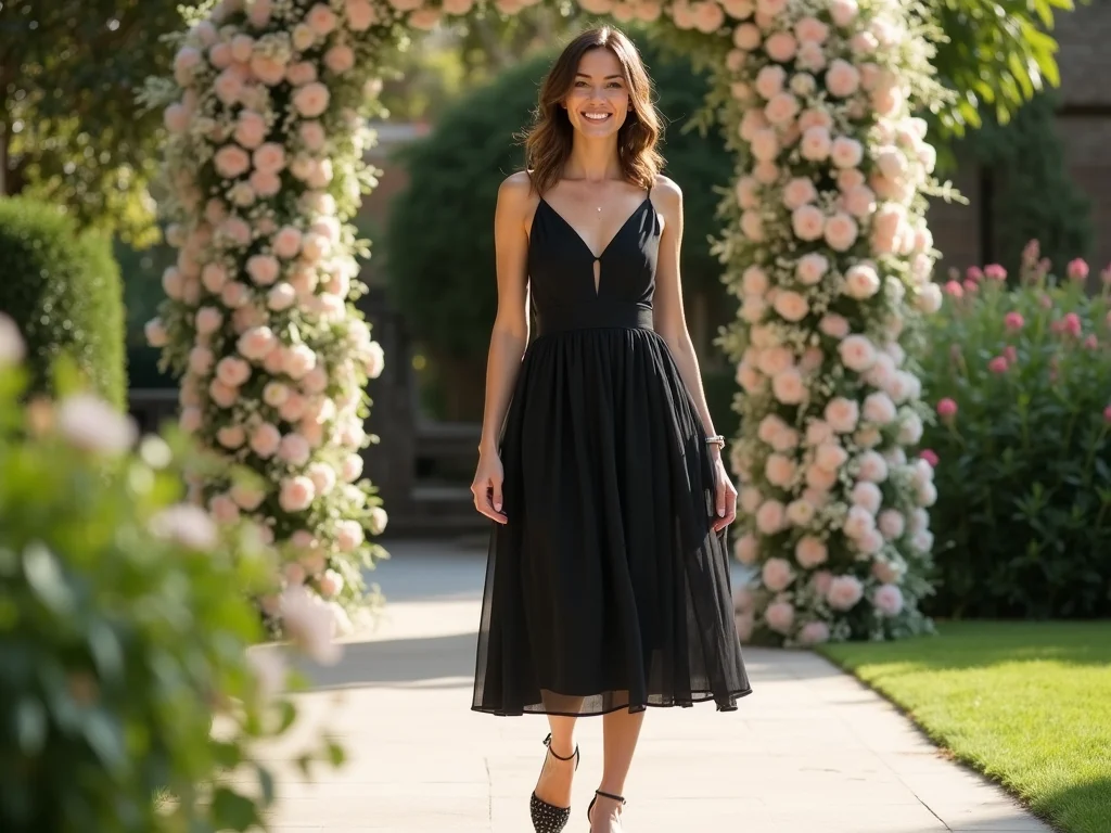 Dica Prática: Se optar por um vestido preto liso para um casamento de manhã, capriche nos acessórios. Brincos grandes e coloridos, um colar statement e uma sandália metalizada podem transformar completamente o visual e deixá-lo perfeito para a ocasião.
