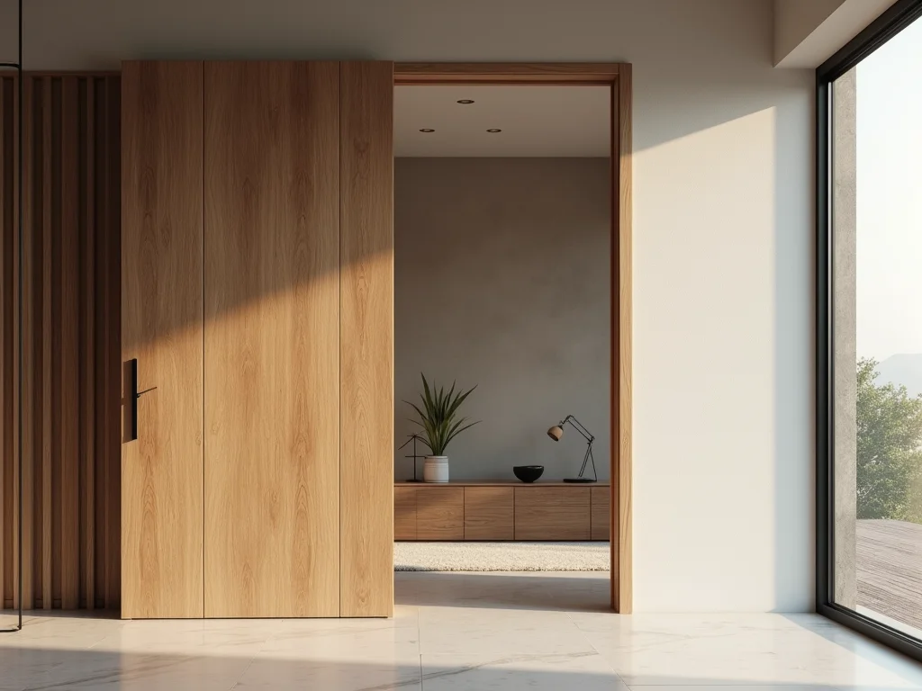 Vista interna de uma porta pivotante de madeira com acabamento acetinado, abrindo para uma sala de estar com mobiliário contemporâneo e piso de madeira clara.
