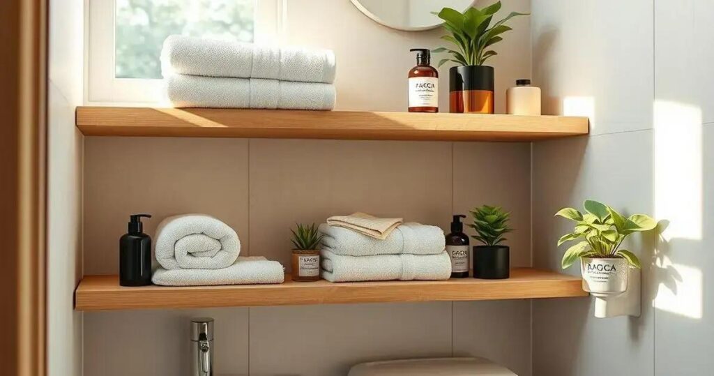6. Organize seus objetos: Coloque seus produtos de higiene pessoal, toalhas e objetos de decoração nas prateleiras.