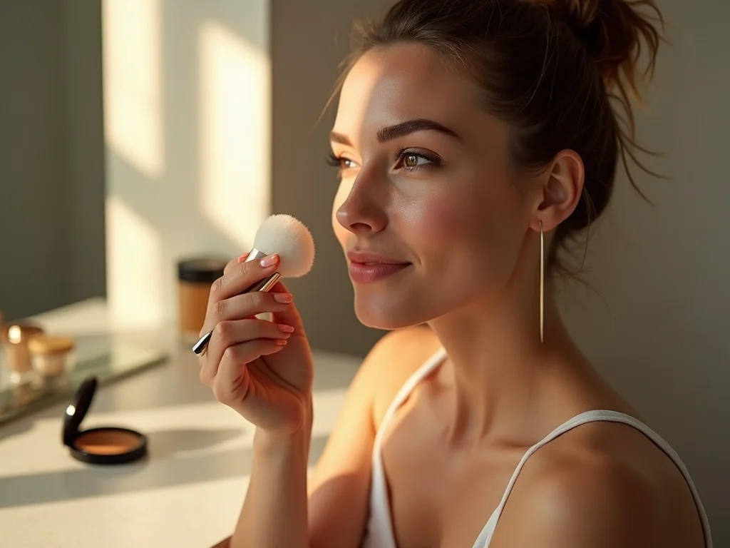 Aplicação de protetor solar em pó com pincel denso para cobertura máxima, mostrando a uniformidade.