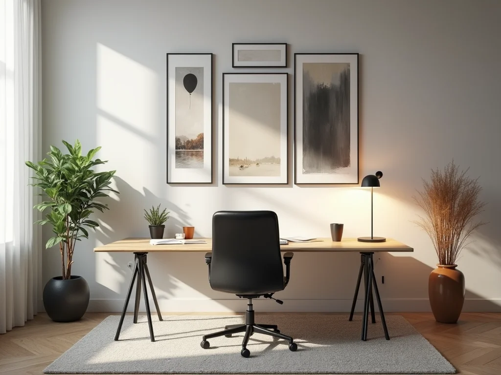 - Pense na escala: Um quadro grande pode ser o ponto focal de um home office pequeno, enquanto vários menores criam um mural interessante em espaços maiores.