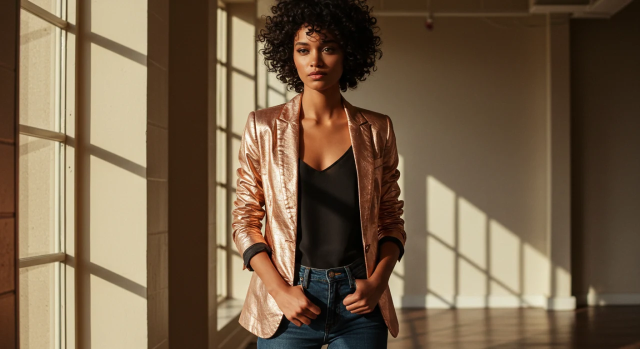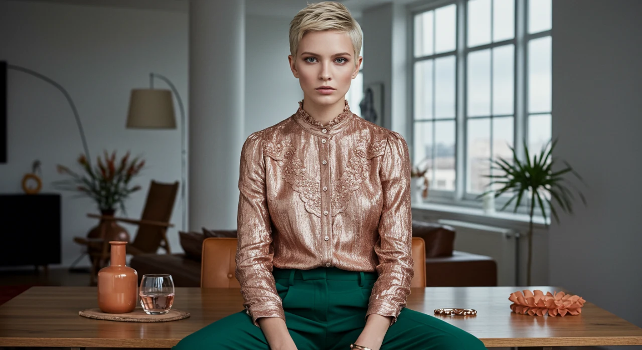 Para o trabalho, combine uma blusa rosé gold com uma calça de alfaiataria preta ou cinza, um blazer e um scarpin. Um colar delicado e uma bolsa estruturada completam o look. Evite peças muito chamativas ou decotadas, e aposte em um visual elegante e discreto.