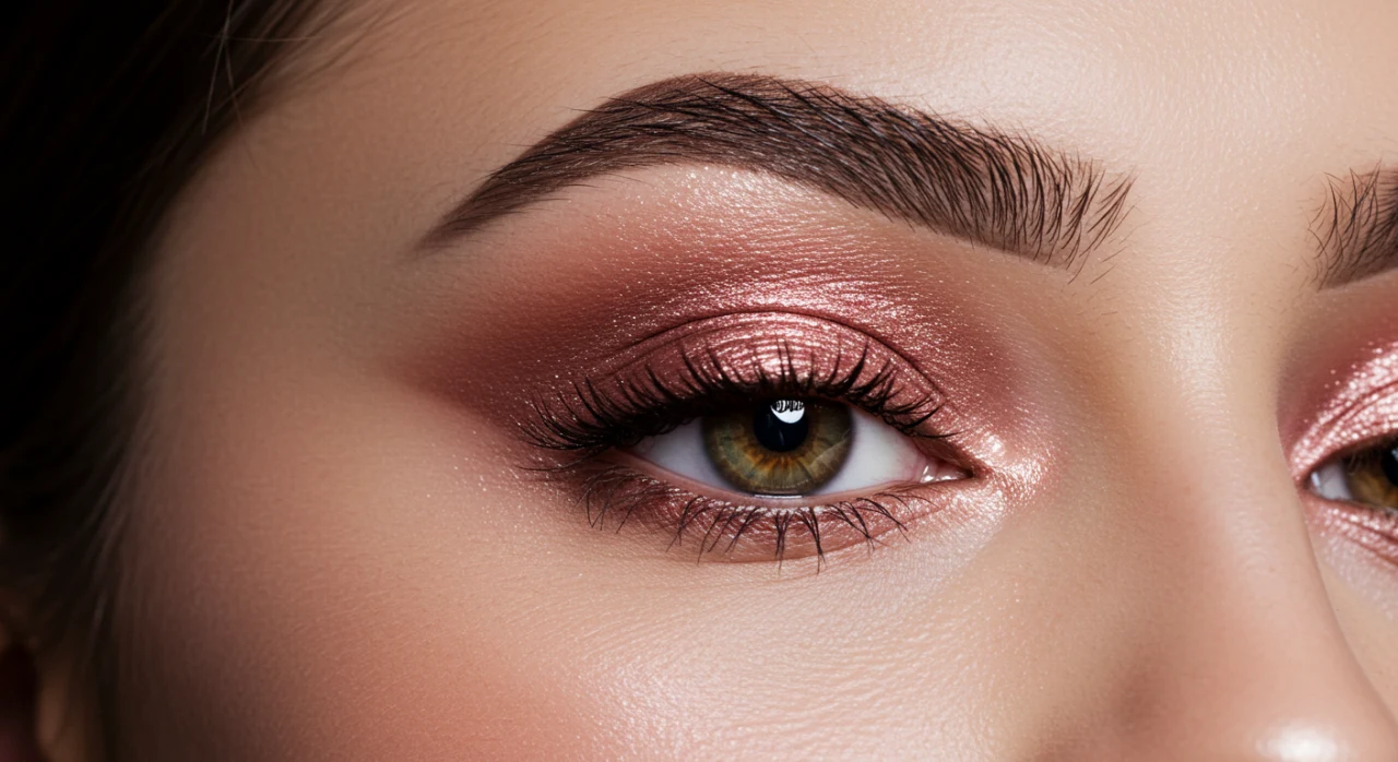 Detalhes de maquiagem: sombra rosé gold e batom nude, beleza e sofisticação.