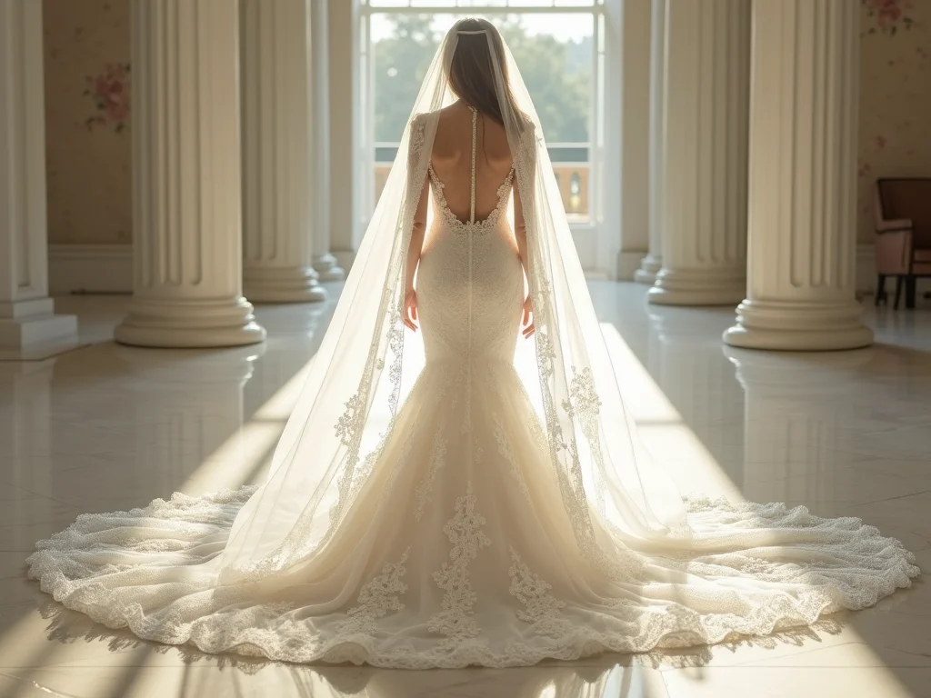 Um véu catedral, especialmente os mais longos com 4 a 5 metros, demanda uma quantidade considerável de renda. Espere precisar de 12 a 15 metros de renda para garantir que a aplicação fique suntuosa e bem distribuída, considerando a largura padrão do tule.