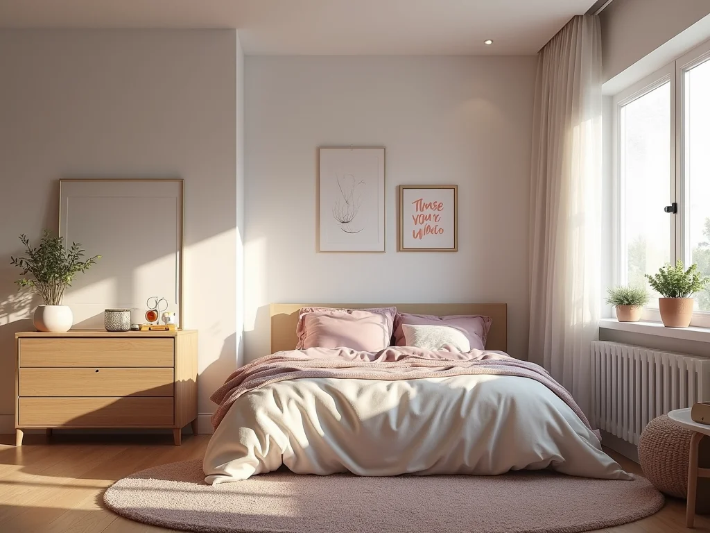 O quarto é um reflexo da personalidade. Quadros com frases inspiradoras, pôsteres de artistas favoritos, espelhos com molduras interessantes e uma coleção de almofadas e mantas com texturas variadas adicionam calor e estilo.