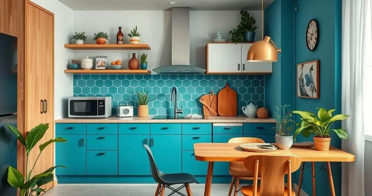 Cores claras, como branco, bege e tons pastel, ajudam a ampliar o espaço e refletir a luz. Se quiser adicionar um toque de cor, use em detalhes como acessórios e utensílios.