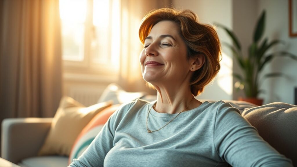 Mulher relaxando com olhos fechados. Relaxamento muscular progressivo para bem-estar.