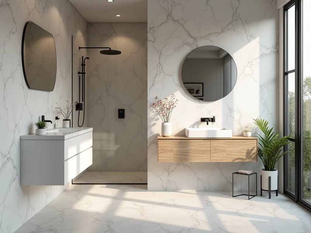 Revestimento de porcelanato marmorizado em grandes placas nas paredes e piso, com bancada de quartzo branco.