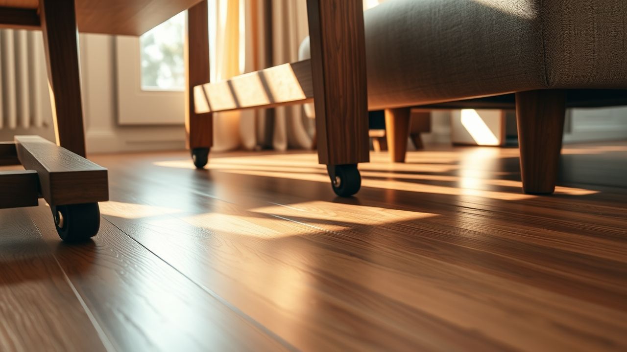Rodízio de móvel deslizando suavemente em piso de madeira polido.