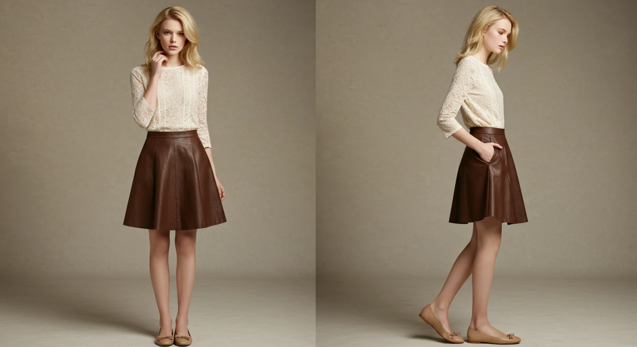Se você prefere um estilo mais romântico, a saia evasê de couro é a escolha certa. Combine-a com uma blusa de renda e uma sapatilha para um look delicado e feminino.