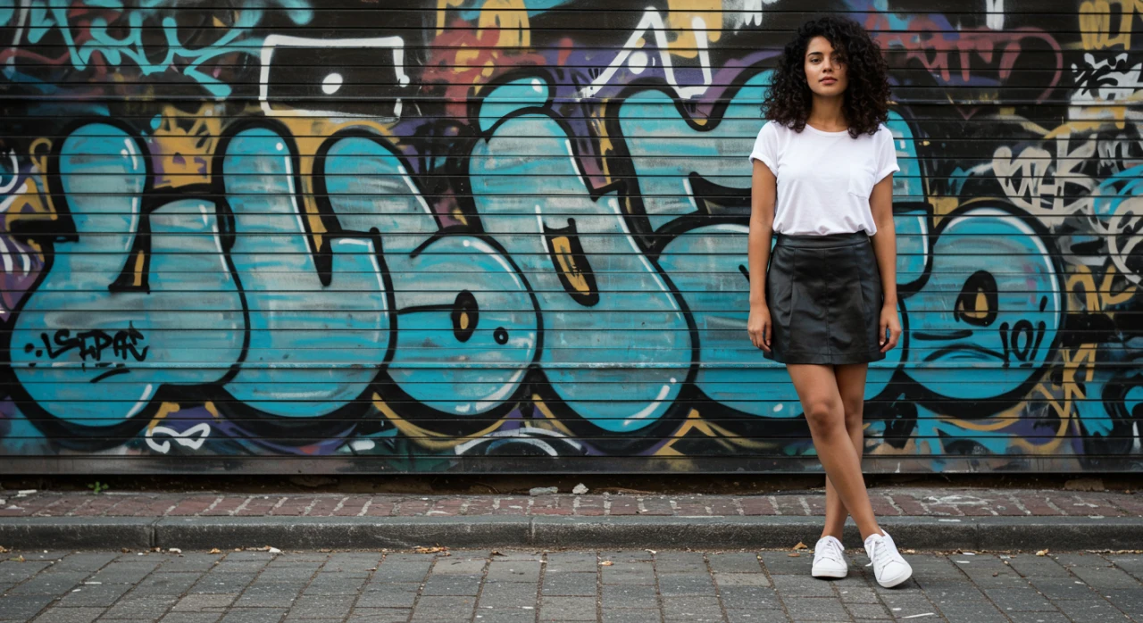 Mulher brasileira estilosa com saia de couro, camiseta branca e tênis, look casual chic.