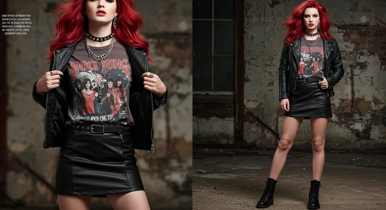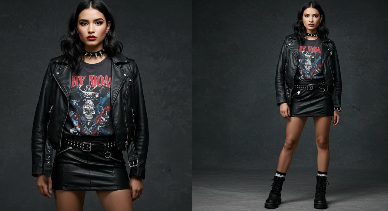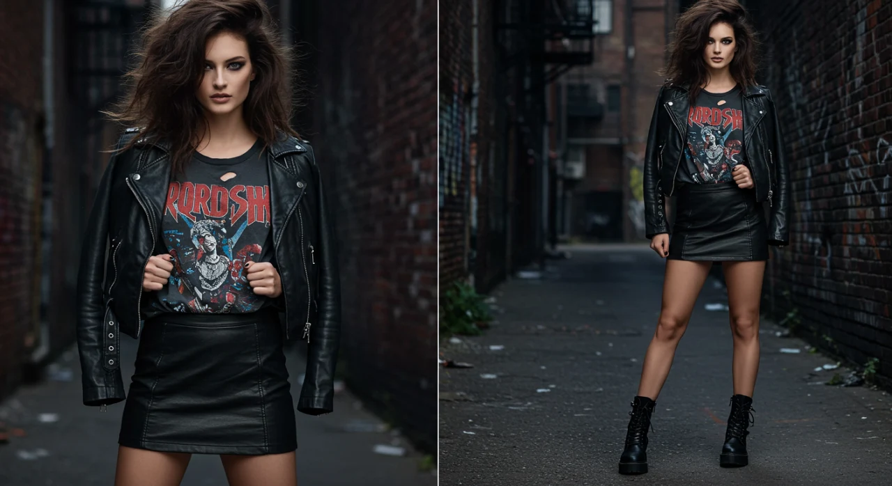 5. Look Rocker: Saia de Couro + Camiseta de Banda + Jaqueta de Couro + Coturno