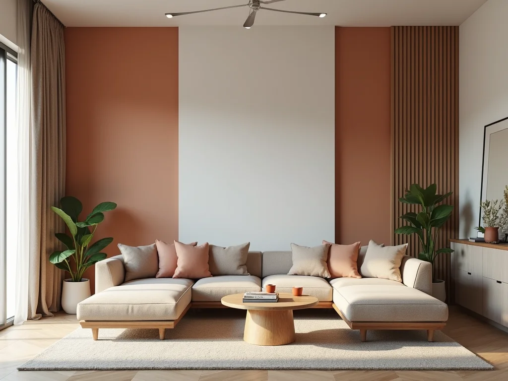 Divisão de parede em sala com cor de barro na parte inferior e um tom pastel de pêssego na superior, com plantas decorativas.