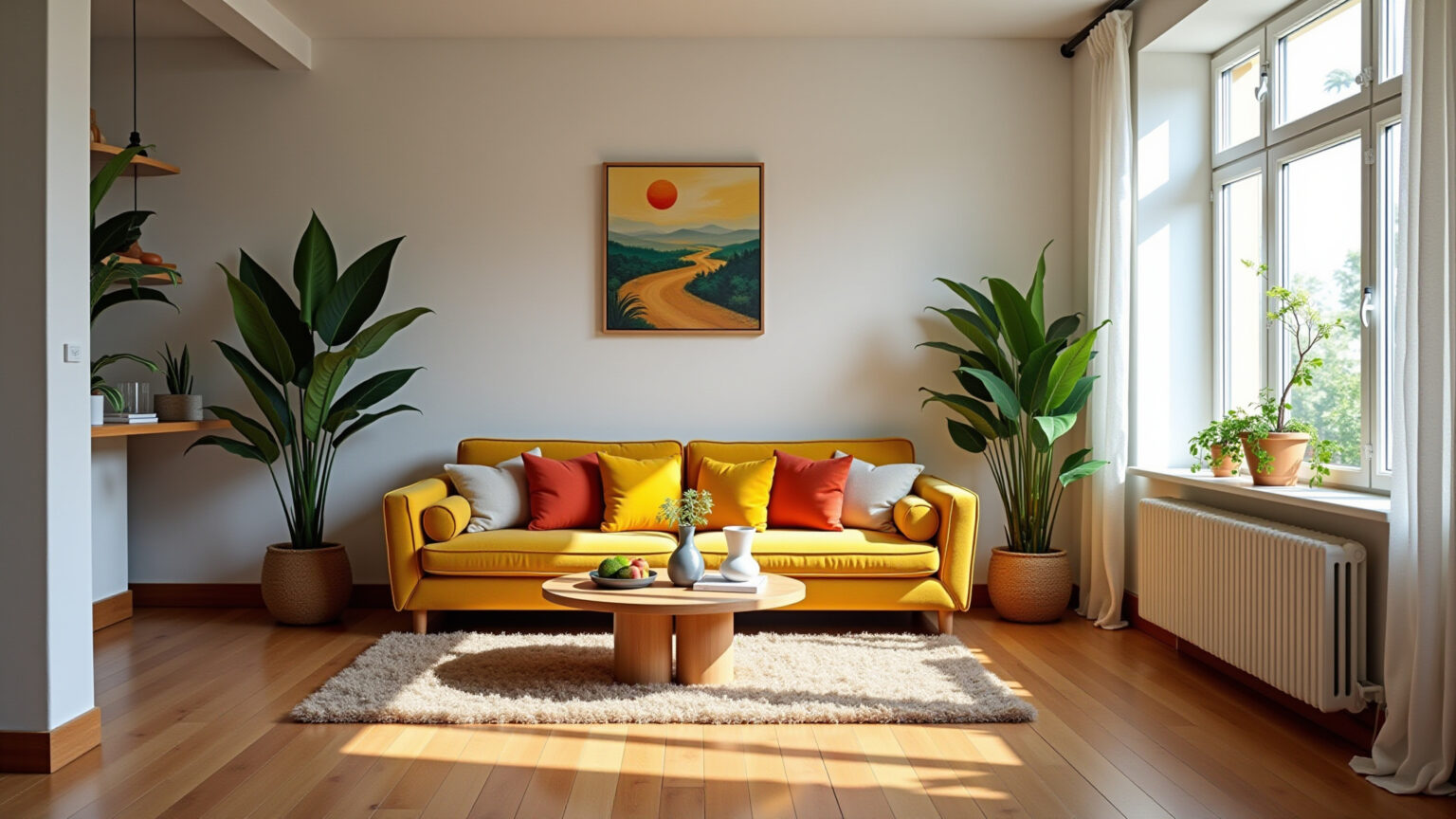 Sala moderna com piso claro, decoração minimalista e iluminação natural abundante.
