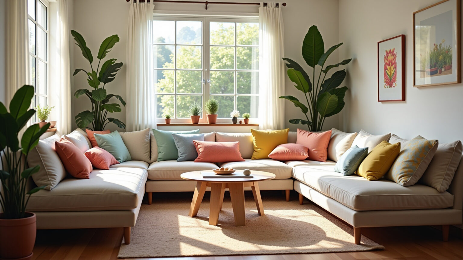 Almofadas e mantas são essenciais para criar uma atmosfera acolhedora na sua sala de estar. Escolha tecidos macios e confortáveis, como algodão, linho e lã. Cores vibrantes e estampas divertidas dão um toque de alegria ao ambiente.